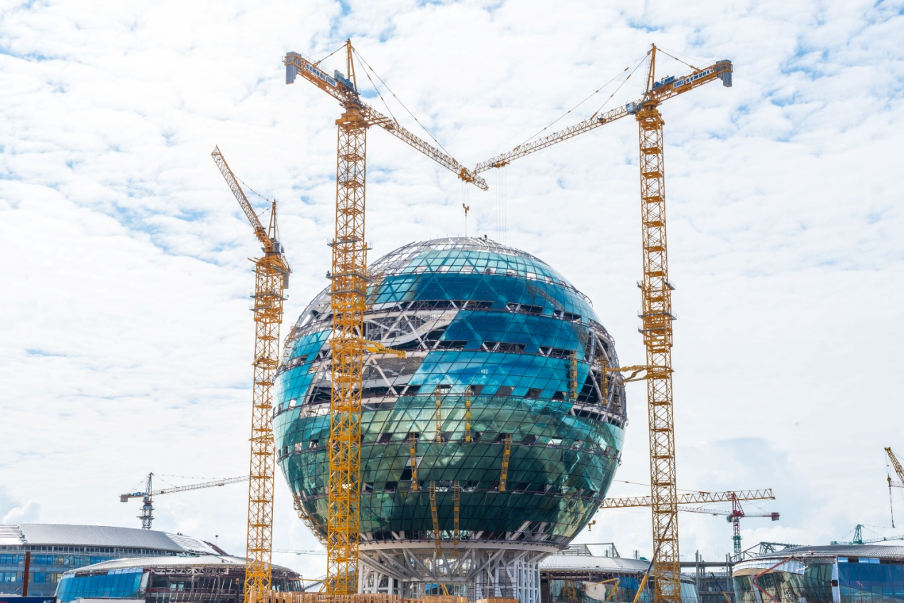 位于哈首都新區的“2017阿斯塔納世博會”主場館占地5000平米,設計高度100米,直徑80米,是目前世界上最大的單體球形建筑。這座兼具現代感與科技感的恢弘展館建設,離不開中聯重科工程機械的深度參與。項目建設期間,中聯重科12臺大噸位塔機、7臺汽車起重機和1臺推土機投入展館施工。其中,4臺D1100-63超大噸位塔機是中亞地區起重能力最強的重型塔機,更是確保主場館項目順利完工的中堅力量。